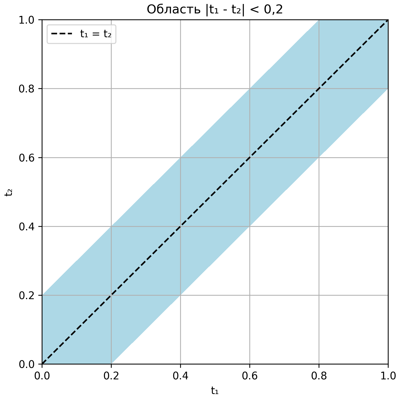 Благоприятным исходом будет считаться такой, при котором \({|t}_{1} - t_{2}| < 0,2\). Это — две полосы вдоль главной диагонали квадрата шириной 0,2. Геометрически они составляют следующую площадь: