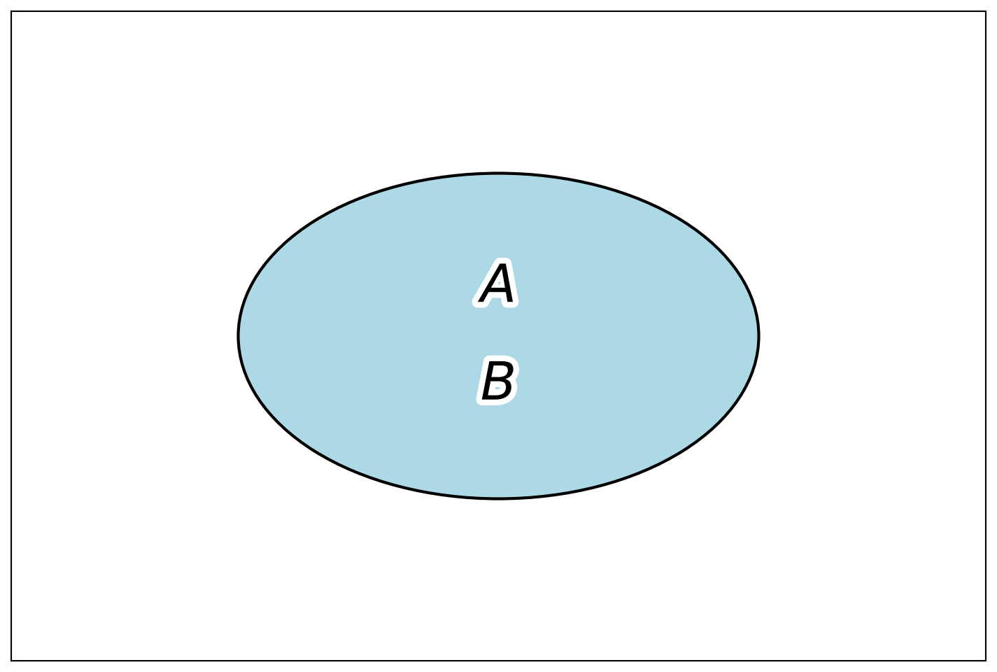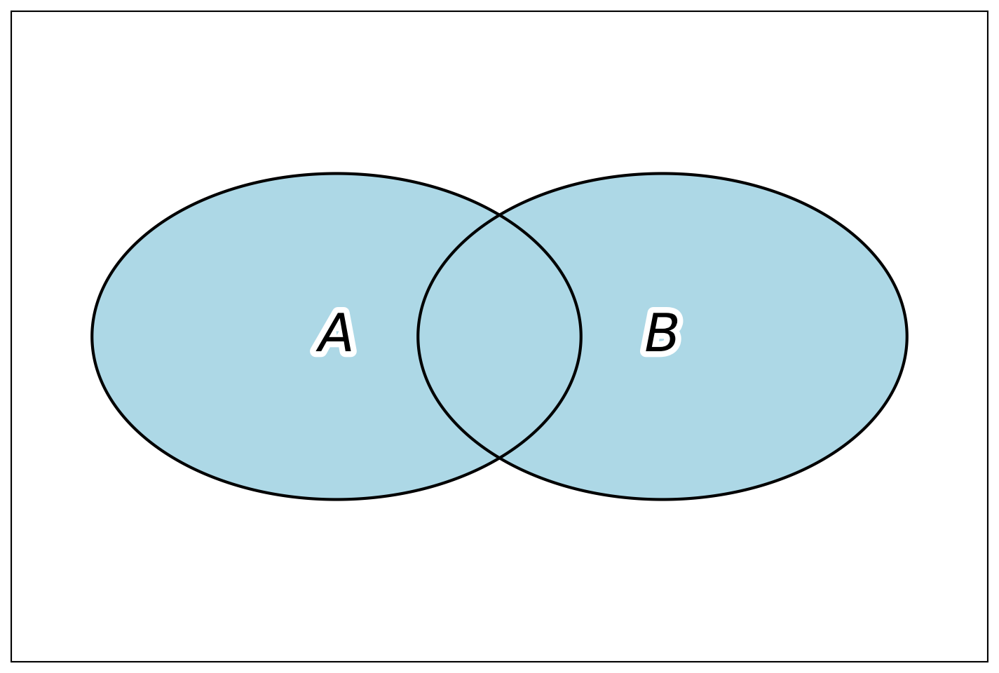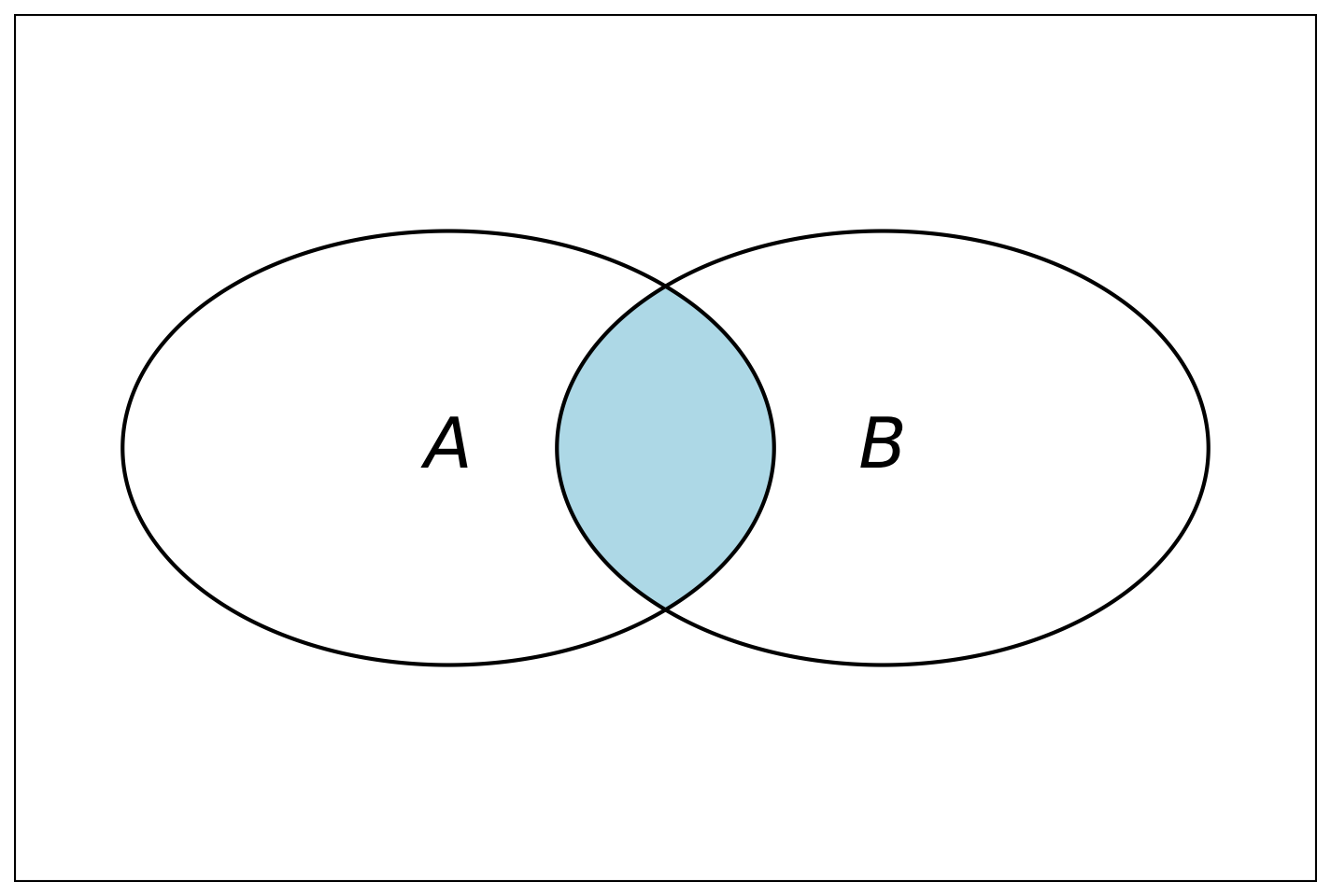 Для лучшего понимания отношений между событиями применяют особый вид геометрических иллюстраций — диаграммы Венна[^3]. На таких диаграммах прямоугольник обозначает всё множество возможных результатов опыта — то есть все элементарные события, которые могут произойти. Сами события, которые нас интересуют, изображаются как области произвольной формы внутри прямоугольника — чаще всего овалы или круги. Если нужно оценить вероятность, то площадь области, представляющей событие, можно считать пропорциональной вероятности этого события — при этом предполагается, что вся площадь прямоугольника равна 1.